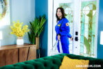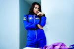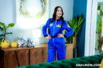 Ivy Ireland, busty MILF with long dark hair, tattoos, dark nails, and red lips, kicks off nude on bed, legs spread wide exposing hairy pussy and asshole. In blue astronaut suit and silver boots, she bends over for tattooed stud's anal penetration and pussy licking. Close-ups show cock teasing her wet slit before deep vaginal fucks in missionary, her massive tits bouncing. She straddles reverse cowgirl, hand on clit. Drops to blowjob on purple-shirted guy, deepthroating while watched. Strips to fishnets, rams blue dildo in pussy on table, ass play poses leading to anal creampie cumshot dripping from her stretched hole.