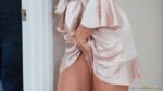 by BrazzersIvy Ireland, hot MILF with long dark hair and stomach tattoo, starts in red sheer lingerie and garter belt on the bed, teasing her pink puss…